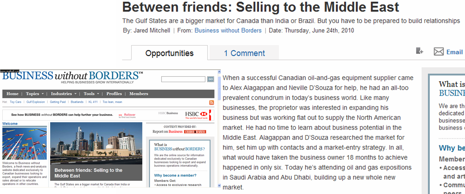 The Managing Editor Jared Mitchell of Business without Borders met with us to present our point-of-view on the opportunitites that are in store for Canadian & US businesses in the Middle East . BWOB is a fresh news-and-analysis website dedicated exclusively to Canadian businesses looking to export, expand their operations and sales abroad or to relocate operations in other countries. Track our coversation with Mitchell, who, as a convert , will certainly be a spokesperson for more International trade and business with the Middle East.