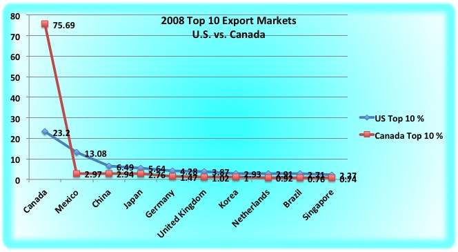 A quick look at the graph alongside should make things crystal clear- the top 10 US export markets account for just 67% of total US exports while for Canada, just the No.1 market- the U.S. accounts for 76 % of our exports. The next four markets- Japan, Germany, the U.K. and Mexico account for another 10% leaving a meager 14 % for the Rest of the World’s contribution to our exports!