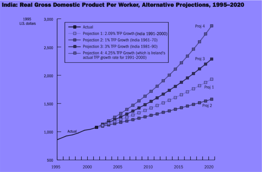 For all four projections, capital, labor, and human capital are assumed to grow at their 1991–2000 average annual growth rates for India- 5.41, 2.23, and 0.58 percent, respectively. For the growth-TFP decomposition to be more precise, labor force figures rather than total population are used as a measure of the amount of “labor” available for use as a factor of production in the Indian economy. According to World Bank databases, in 2001 India’s GDP (in 1995 U.S. dollars) was $495 billion and its population was 1.03 billion, of which only 461 million were in the labor force. As such, India’s GDP per capita in 2001 was approximately $480, whereas GDP per worker was around $1,070.