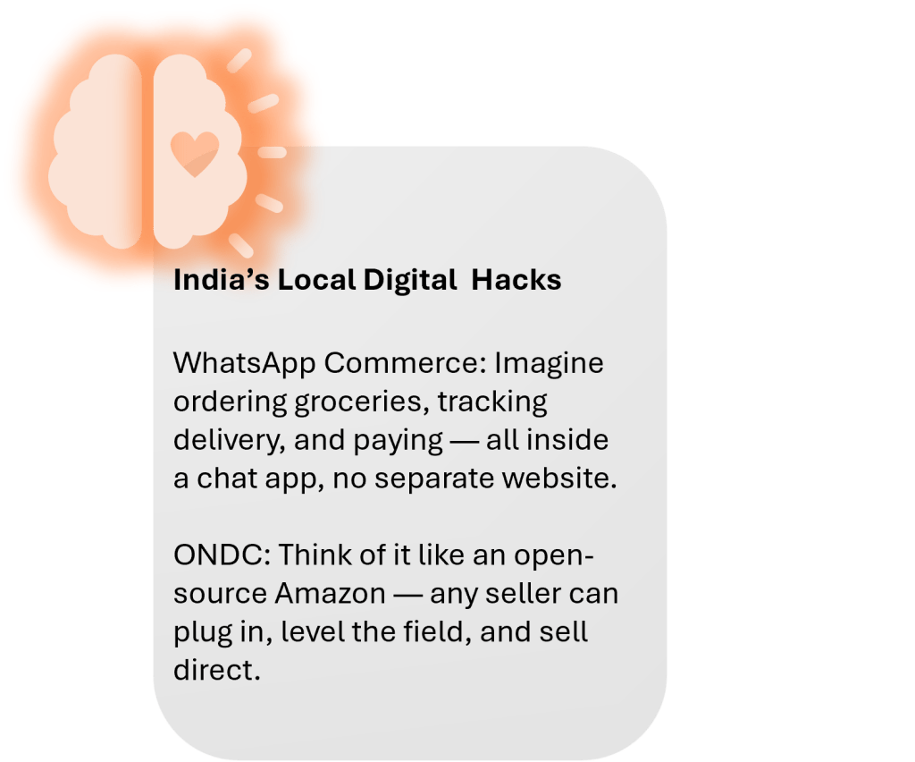• Digital strategy has to bend to India’s digital ecosystem: WhatsApp for commerce, regional social influencers, UPI payments, and now ONDC — an open digital commerce network that flips the script on closed marketplaces.